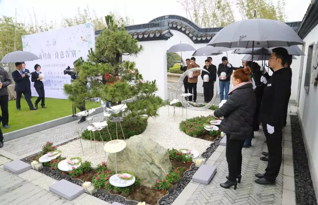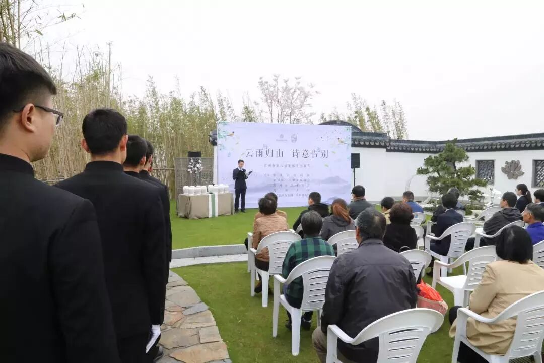 本次集体生态葬礼以“云雨归山 诗意告别”为主题,整个礼仪场景以江南水墨元素为基调,布置的清新淡雅。