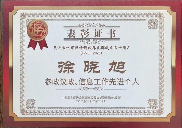 近日,民进常州市经济科技总支部召开成立三十周年高质量发展大会。大会全面回顾了总支三十年来的发展历程与履职成果,并对在各领域作出突出贡献的会员进行了表彰,常州栖凤山总经理徐晓旭荣获“参政议政、信息工作先进个人”荣誉称号。